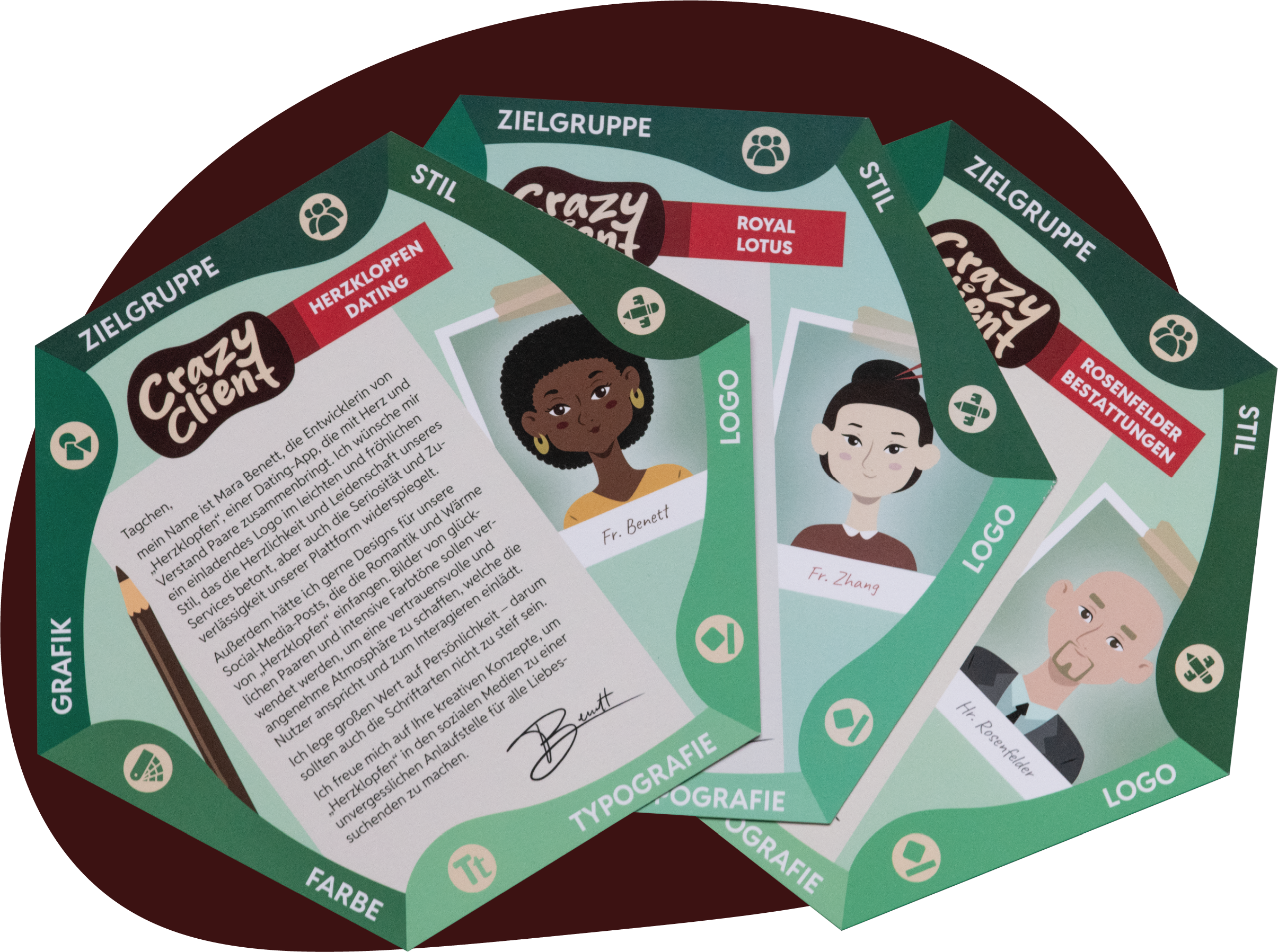 Du findest zehn unterschiedliche und abwechslungsreiche Kundenaufträge mit detaillierten Wünschen und Angaben als Basis zur Planung deiner Gestaltung, zusammengefasst auf den Client-Boards.