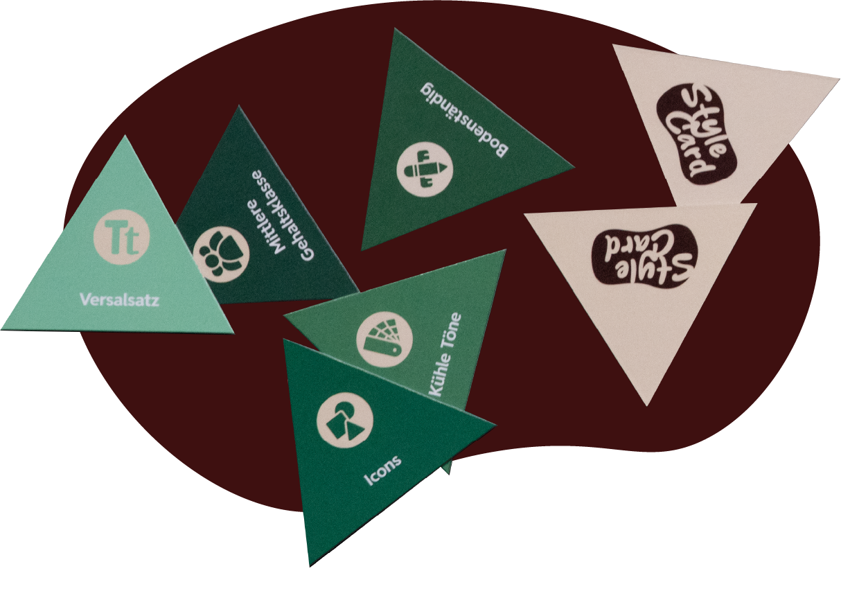 Um die Umsetzung des Auftrages zu planen und vor Augen zu haben, bieten die Style-Cards eine große Auswahl an Fachbegriffen, die in sechs Kategorien, wie z.B. die Zielgruppe eingeteilt sind und an die passende Rubrik des Client-Boards angelegt werden können.